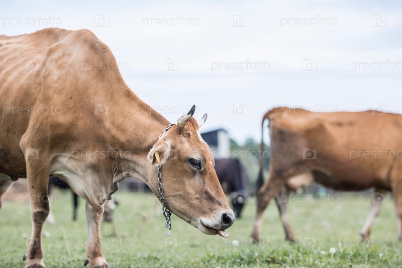 Домашний скот. Коровы пасутся на лугу. Концепция животноводства и сельской жизни. Чипирование животных. Питомец на экоферме. Сельскохозяйственная промышленность