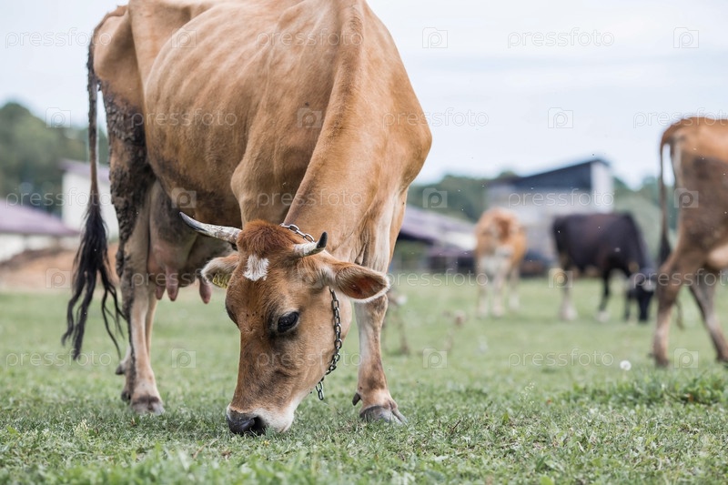 Домашний скот. Коровы пасутся на лугу. Концепция животноводства и сельской жизни. Чипирование животных. Питомец на экоферме. Сельскохозяйственная промышленность