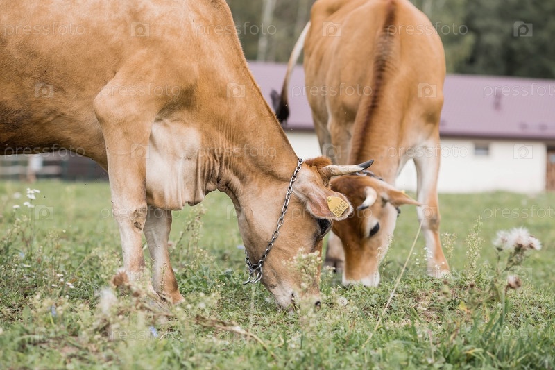 Домашний скот. Коровы пасутся на лугу. Концепция животноводства и сельской жизни. Чипирование животных. Питомец на экоферме. Сельскохозяйственная промышленность