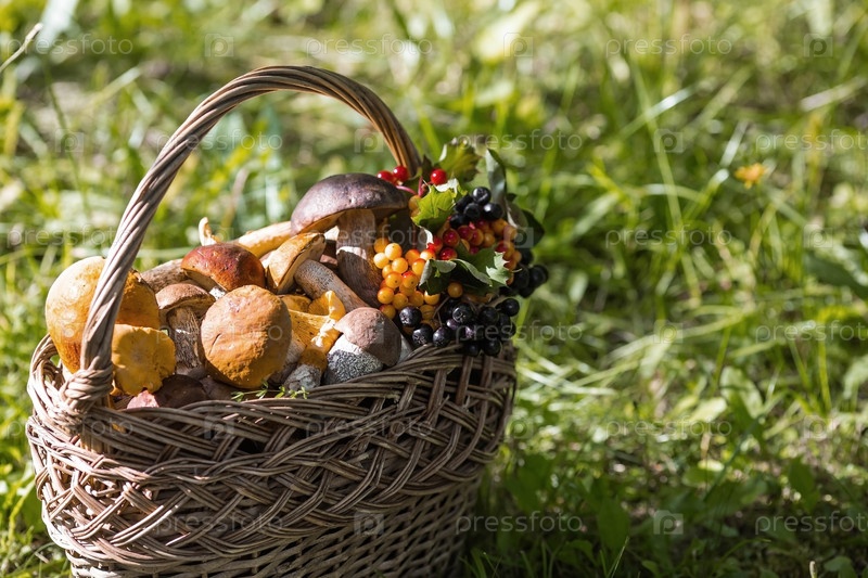 Благородные съедобные грибы. Ассорти из грибов в красивой плетеной корзине в березовом лесу. Красивая текстура естественного фона