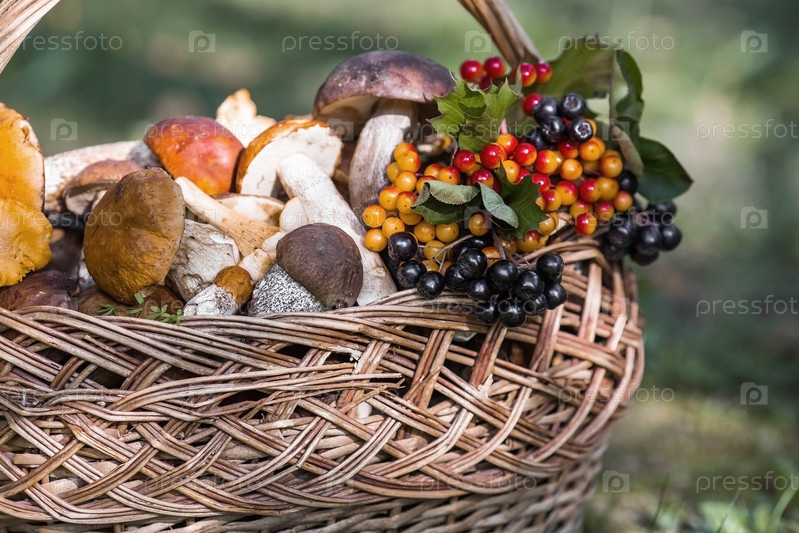 Благородные съедобные грибы. Ассорти из грибов в красивой плетеной корзине в березовом лесу. Красивая текстура естественного фона