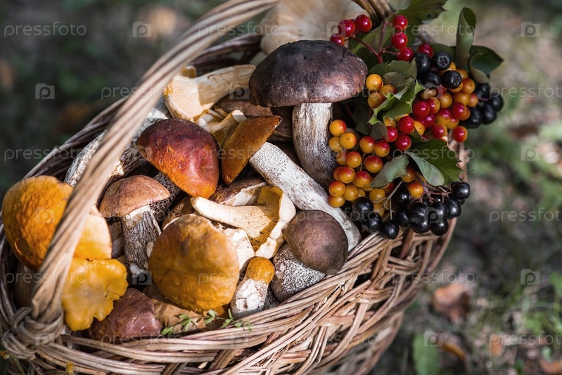 Благородные съедобные грибы. Ассорти из грибов в красивой плетеной корзине в березовом лесу. Красивая текстура естественного фона