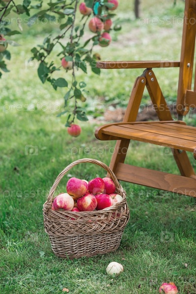 Плетеная корзина, полная свежих фруктов. Корзина с красными яблоками. Прекрасный солнечный свет. Осенний урожай, сбор урожая или заготовка