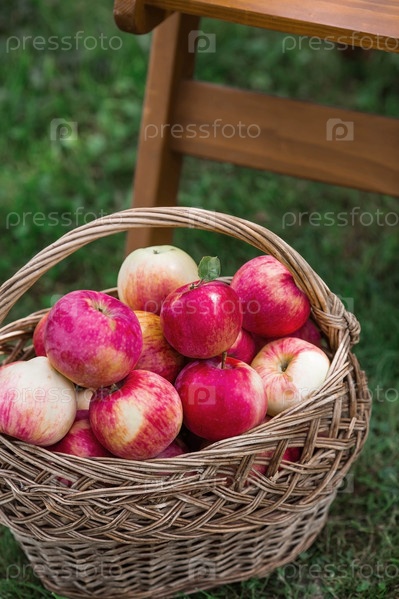Плетеная корзина, полная свежих фруктов. Корзина с красными яблоками. Прекрасный солнечный свет. Осенний урожай, сбор урожая или заготовка