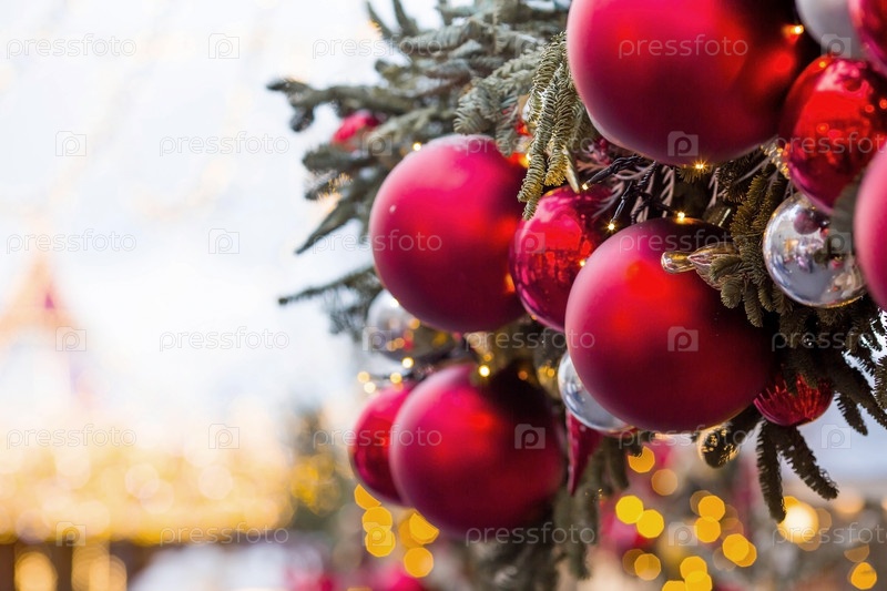 Красивые праздничные украшения на елке. Крупный план. Красивый рождественский фон. Концепция украшений и декора на новый год. Новогодняя открытка 2025