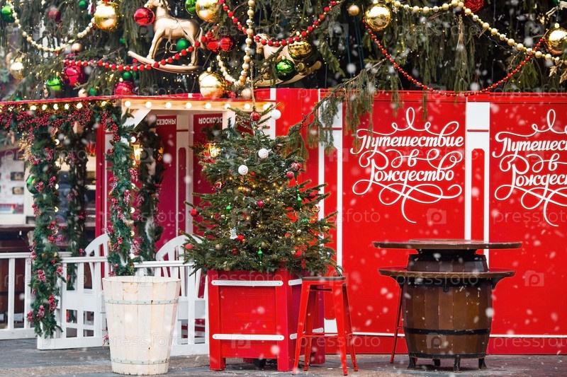 Новый год 2025. Новогодние украшения и игрушки на улицах города. Рождественские праздники, зимний новогодний декор в центре Москвы