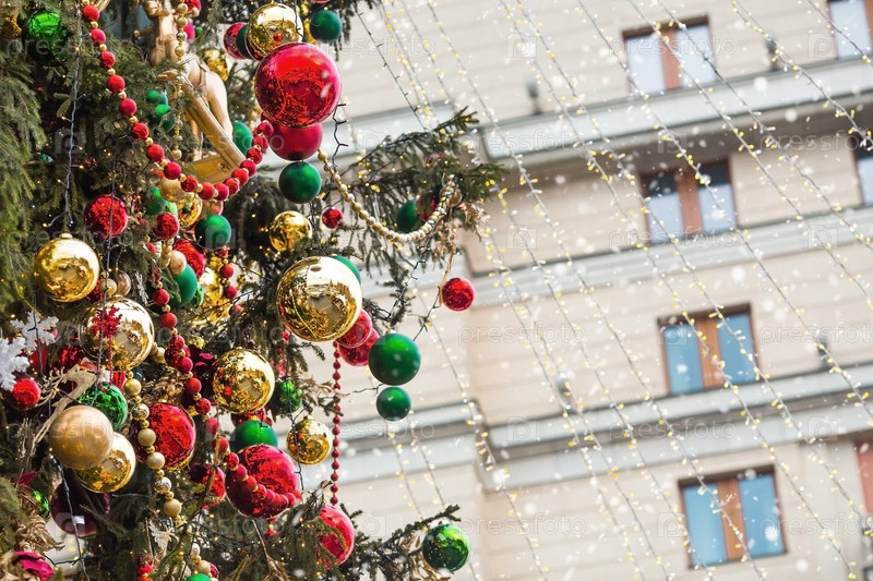 Красивые праздничные украшения на елке. Крупный план. Красивый рождественский фон. Концепция украшений и декора на новый год. Новогодняя открытка 2025