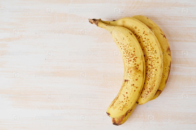 Спелые бананы с коричневыми пятнами на ярко-белом деревянном столе, место для копирования, вид сверху