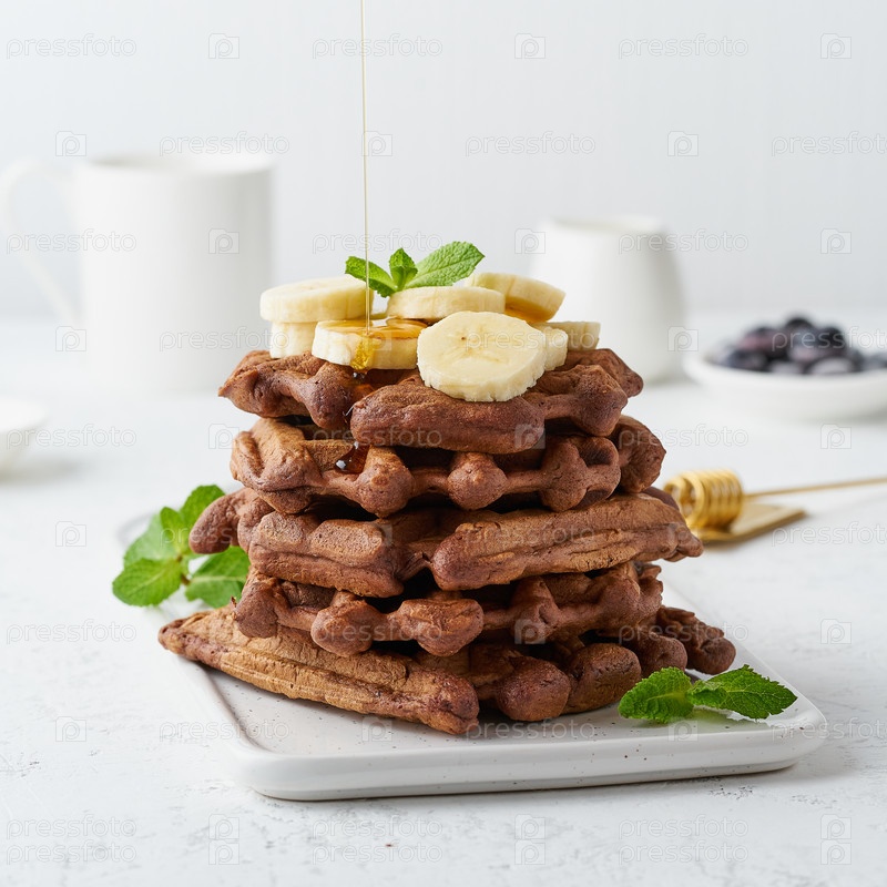 Шоколадные банановые вафли с кленовым сиропом на белом столе, вид сбоку. Сладкий бранч, поток кленового сиропа