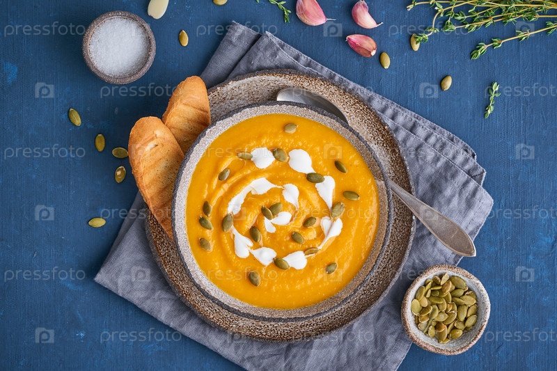 Суп-пюре из тыквы на темно-синем деревянном столе, диетический вегетарианский обед, вид сверху