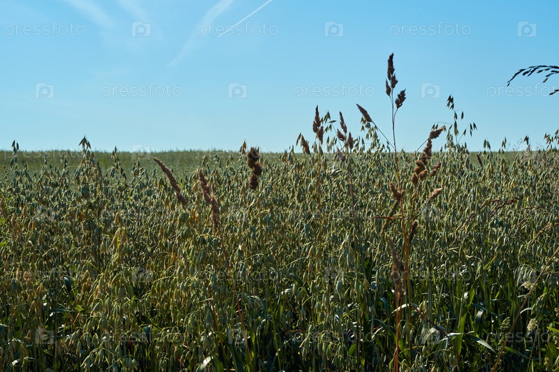 Поле с зелеными колосьями овса на фоне голубого неба в солнечный день, сельское хозяйство
