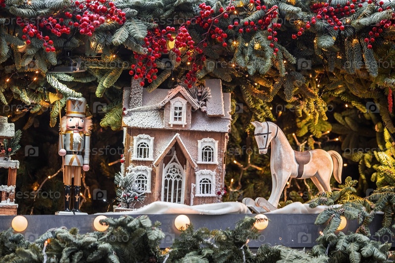 Новый год 2025. Новогодние украшения и игрушки на улицах города. Рождественские праздники, зимний новогодний декор в центре Москвы