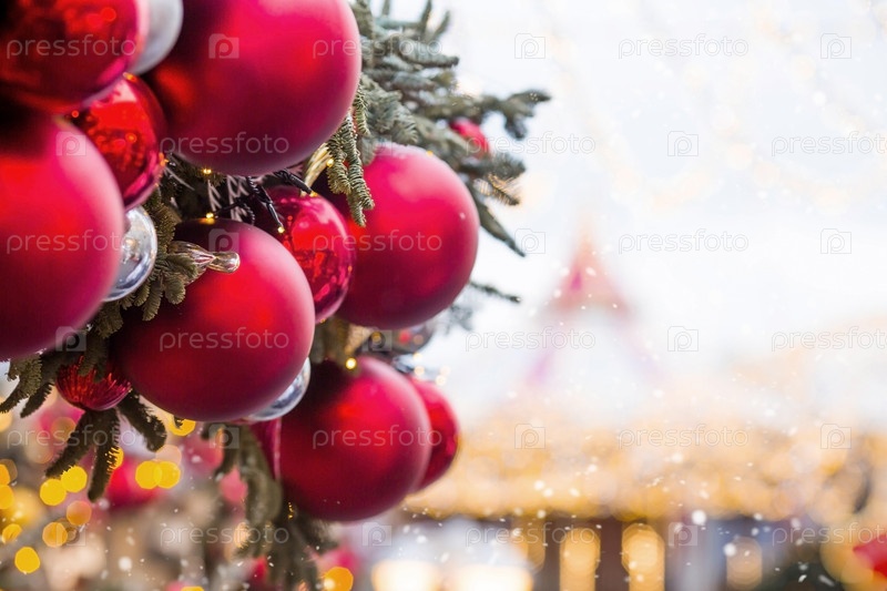 Красивые праздничные украшения на елке. Крупный план. Красивый рождественский фон. Концепция украшений и декора на новый год. Новогодняя открытка 2025