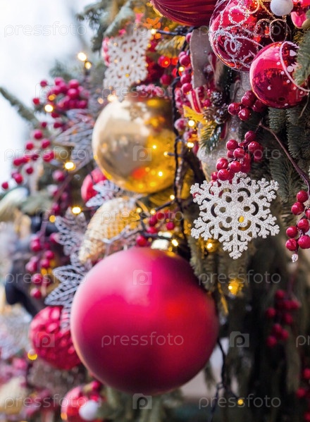 Красивые праздничные украшения на елке. Крупный план. Красивый рождественский фон. Концепция украшений и декора на новый год. Новогодняя открытка 2025