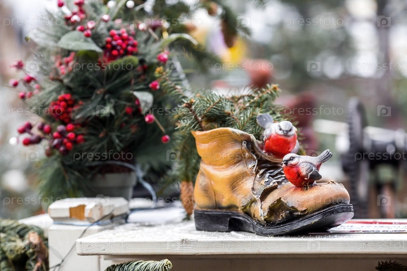 Новый год 2025. Елочные украшения и игрушки на улицах города. Сапоги и снегири. Зимний новогодний декор в центре Москвы