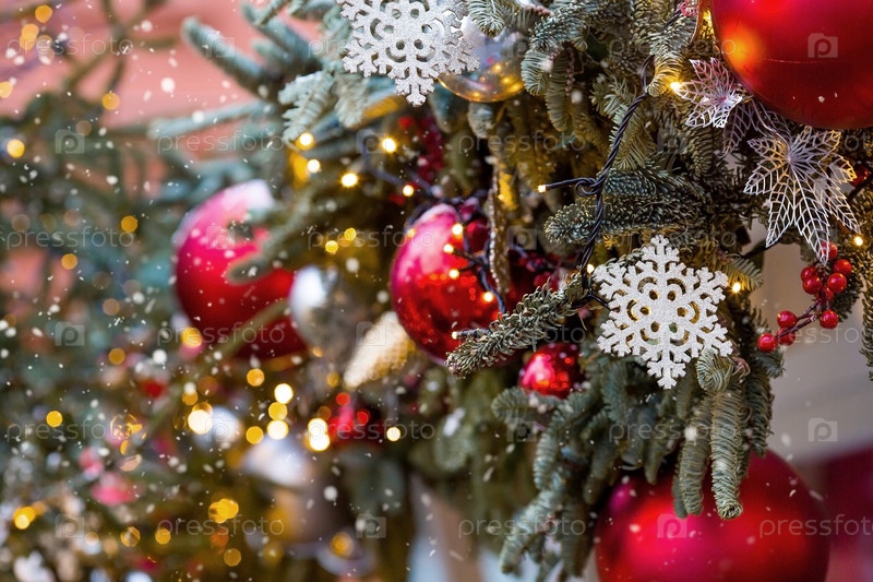 Красивые праздничные украшения на елке. Крупный план. Красивый рождественский фон. Концепция украшений и декора на новый год. Новогодняя открытка 2025