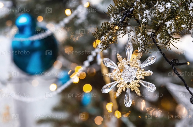 Красивое праздничное украшение снежинки на елку. Крупный план. Красивый рождественский фон. Концепция украшений и декора на новый год. Новогодняя открытка 2025