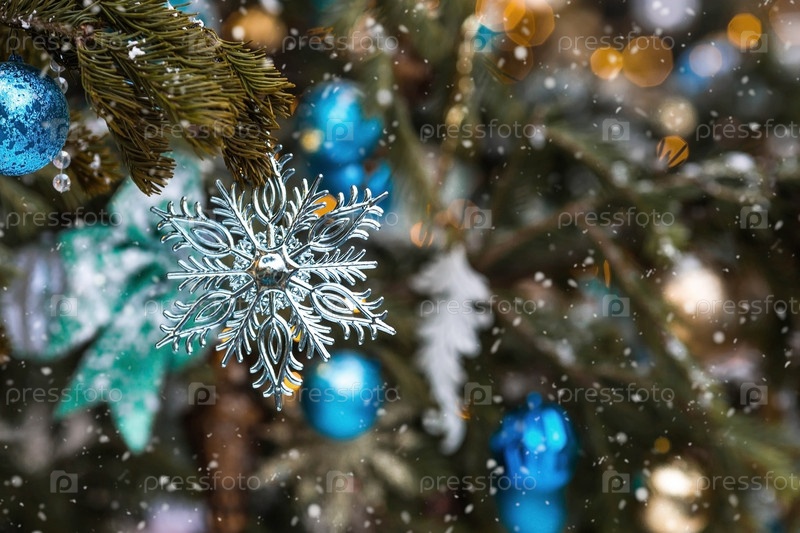 Красивое праздничное украшение снежинки на елку. Крупный план. Красивый рождественский фон. Концепция украшений и декора на новый год. Новогодняя открытка 2025