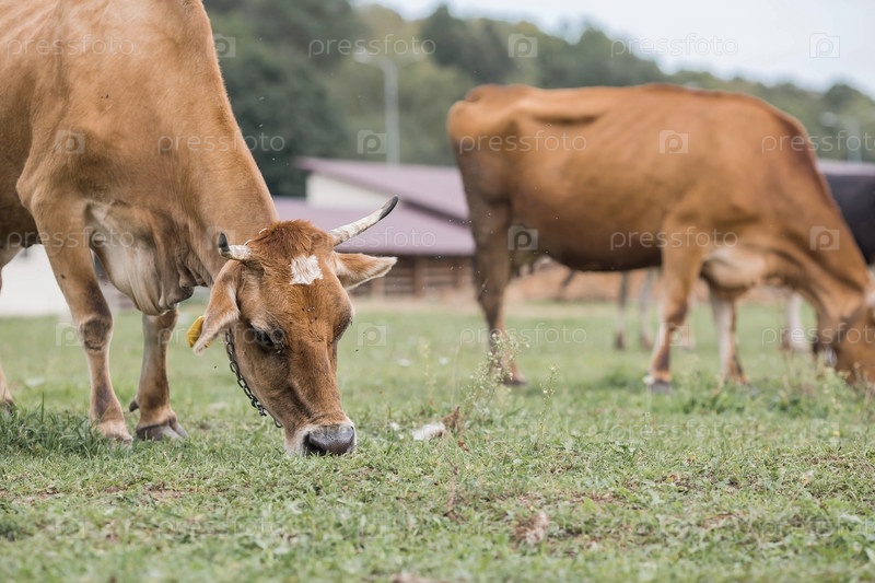 Домашний скот. Коровы пасутся на лугу. Концепция животноводства и сельской жизни. Чипирование животных. Питомец на экоферме. Сельскохозяйственная промышленность