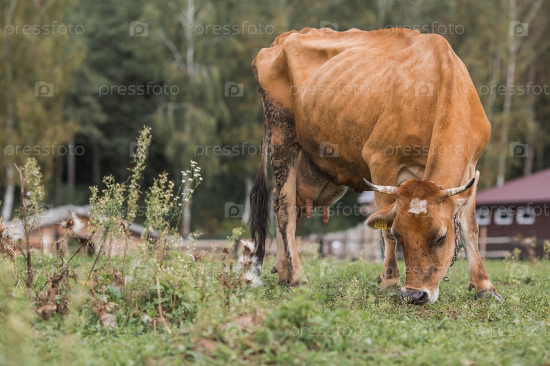 Домашний скот. Коровы пасутся на лугу. Концепция животноводства и сельской жизни. Чипирование животных. Питомец на экоферме. Сельскохозяйственная промышленность