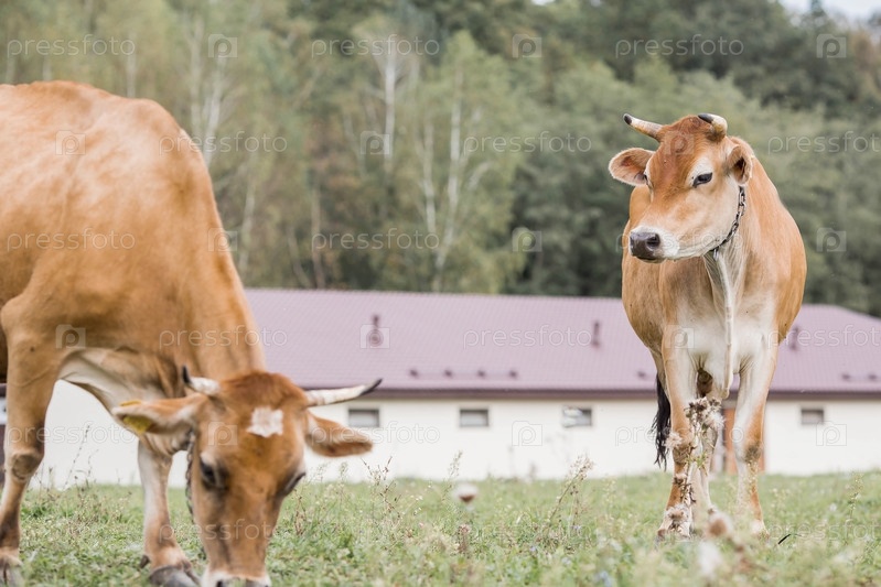 Домашний скот. Коровы пасутся на лугу. Концепция животноводства и сельской жизни. Чипирование животных. Питомец на экоферме. Сельскохозяйственная промышленность