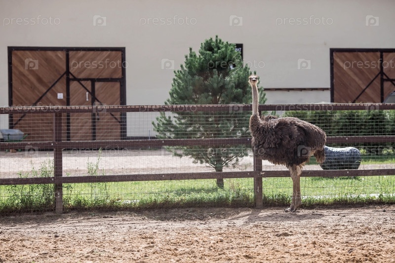 Домашняя птица. Портрет страуса в загоне. Концепция животноводства и сельской жизни. Крупный план. Питомец на экоферме. Сельскохозяйственная промышленность