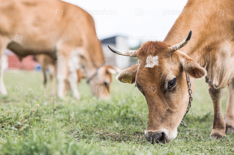 Домашний скот. Коровы пасутся на лугу. Концепция животноводства и сельской жизни. Чипирование животных. Питомец на экоферме. Сельскохозяйственная промышленность