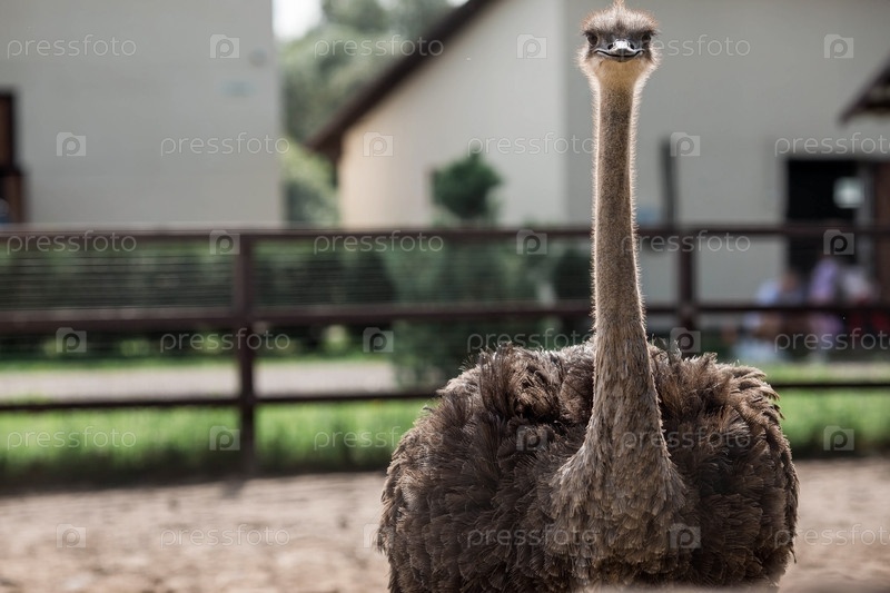 Домашняя птица. Портрет страуса в загоне. Концепция животноводства и сельской жизни. Крупный план. Питомец на экоферме. Сельскохозяйственная промышленность
