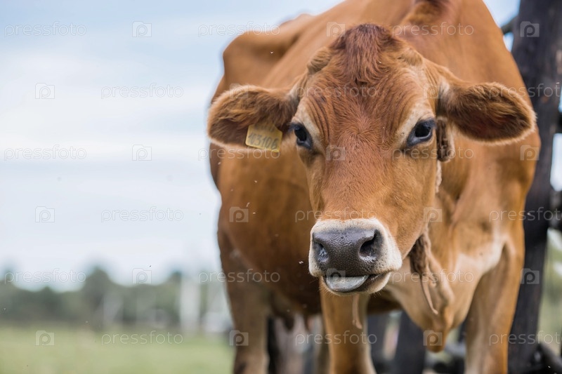Домашний скот. Коровы пасутся на лугу. Концепция животноводства и сельской жизни. Чипирование животных. Питомец на экоферме. Сельскохозяйственная промышленность