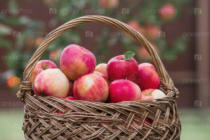 Плетеная корзина, полная свежих фруктов. Корзина с красными яблоками. Прекрасный солнечный свет. Осенний урожай, сбор урожая или заготовка