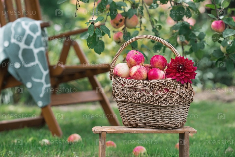 Плетеная корзина, полная свежих фруктов. Корзина с красными яблоками. Прекрасный солнечный свет. Осенний урожай, сбор урожая или заготовка