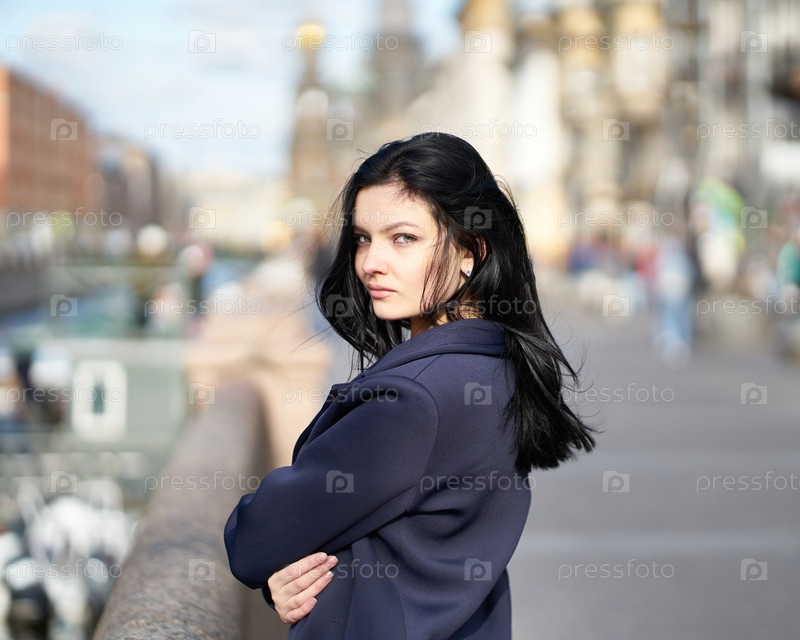 Портрет красивой умной брюнетки, которая идет по улице Санкт-Петербурга в центре города. Очаровательная вдумчивая женщина с длинными темными волосами бродит одна, погруженная в мысли