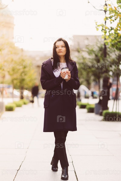 Красивая серьезная умная брюнетка девушка держит чашку кофе в руках идет по улице Санкт-Петербурга в центре города. Очаровательная вдумчивая женщина с длинными темными волосами бродит одна