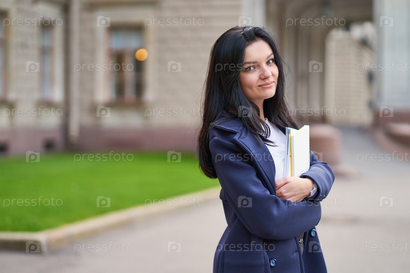 Улыбающаяся девушка брюнетка студентка держит тетради и учебники, стоит в университете на улице Санкт-Петербурга. Очаровательная женщина с длинными темными волосами учится на курсе, получает образование
