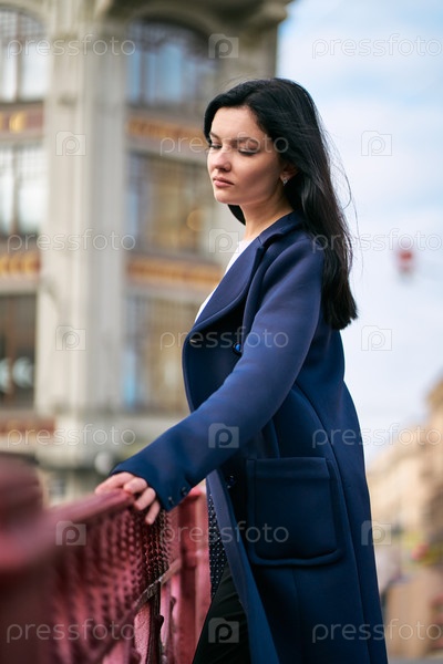 Портрет крупным планом красивой умной брюнетки, которая идет по улице Санкт-Петербурга в центре города. Очаровательная вдумчивая женщина с длинными темными волосами бродит одна, погруженная в мысли