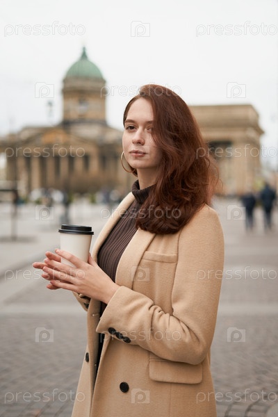 Красивая серьезная стильная модная умная девушка держит чашку кофе в руках идет по улице Санкт-Петербурга в центре города. Очаровательная вдумчивая женщина с длинными темными волосами