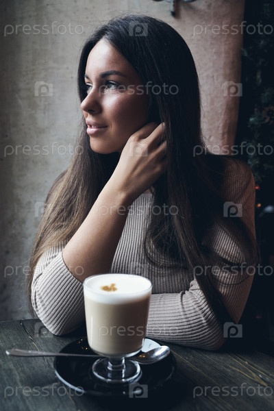 Красивая девушка сидит в кафе в рождественские праздники, на фоне огней гирлянды. Брюнетка с длинными волосами пьет капучино, латте и смотрит в окно, темный фон
