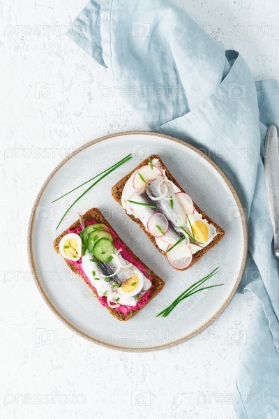 Сморреброд с пикантной рыбой, набор из пяти традиционных датских сэндвичей. Черный ржаной хлеб