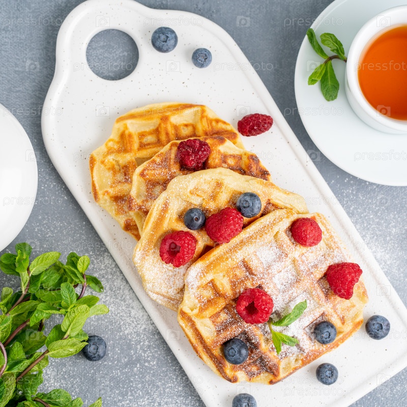 Бельгийские вафли с малиной, черникой, чаем, вид сверху. Здоровый домашний завтрак, синий фон