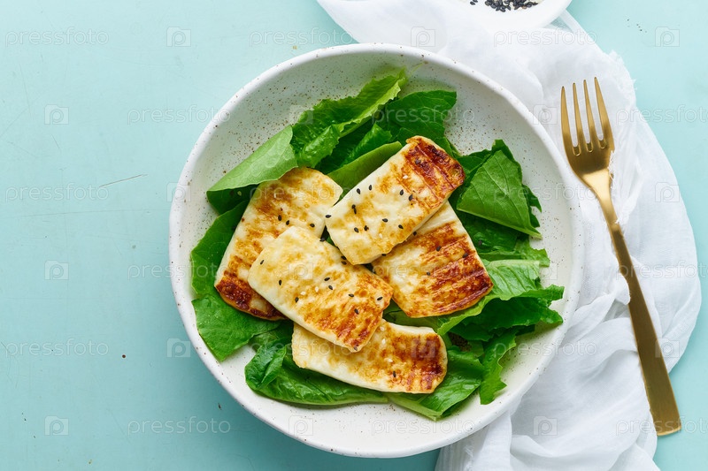 Кето-кетогенная диета халуми с салатом на пастельном фоне крупным планом