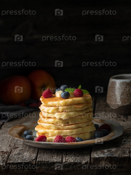 Блин с маслом, черникой и малиной. Вид сбоку, место для копирования