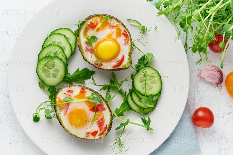 Яйцо, запеченное в авокадо, тост, завтрак,