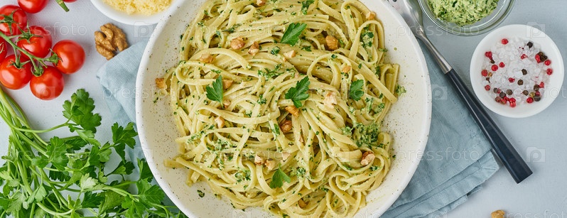 Баннер с пастой песто, баветт с грецкими орехами, петрушкой, чесноком, орехами, оливковым маслом. Вид сверху, длинная сторона, синий фон