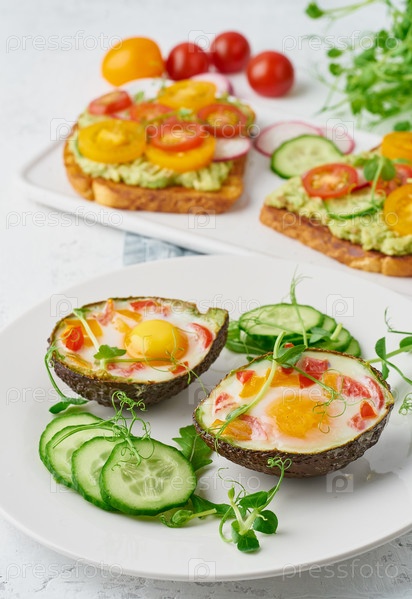 Яйцо, запеченное в авокадо, тост, завтрак,