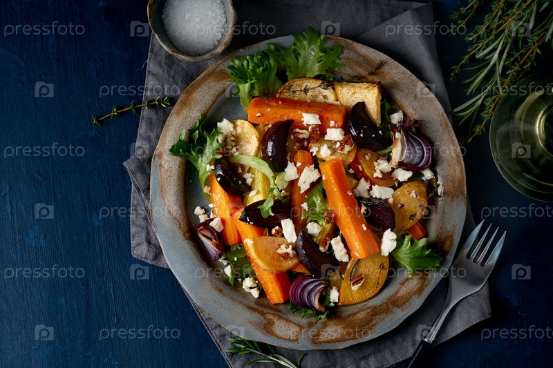 Вегетарианский салат сыр фета, запеченные жареные овощи, кето-кетогенная диета. Смесь морковь, свеклы, репчатая капуста, брюки, лук и орехи. Чистое питание. Вид сверху