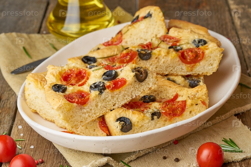 Фокачча, пицца в тарелке с помидорами, оливками и розмарином. Рубленый итальянский плоский хлеб