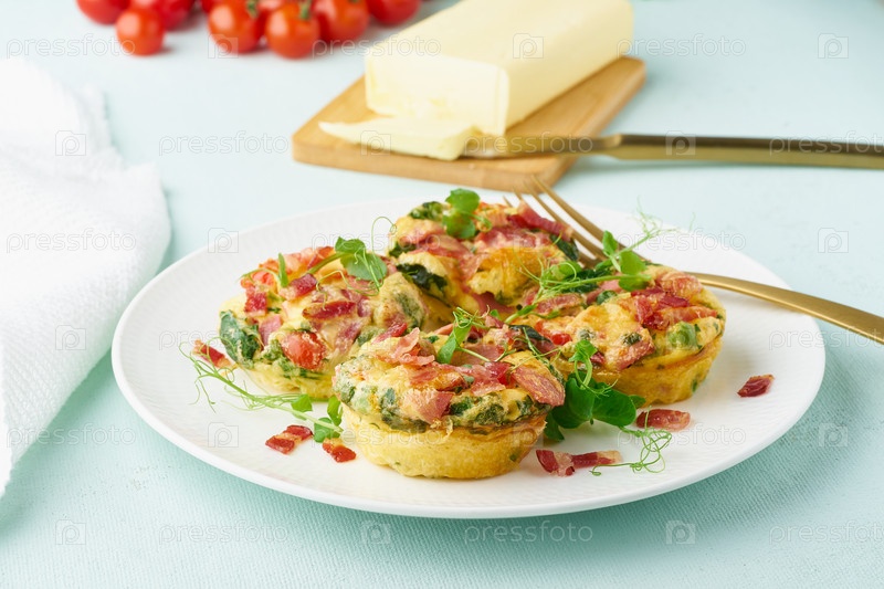 Яичный кекс, запеченный с беконом и помидорами, кетогенная кето-диета, пастельный современный крупный план