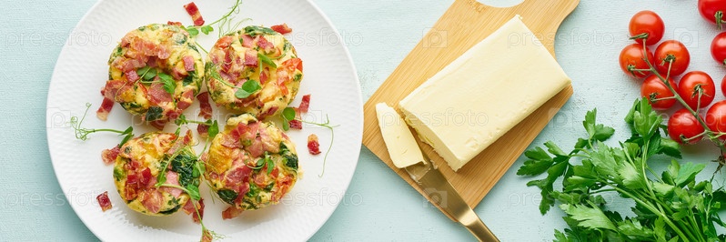 Яичный кекс, запеченный с беконом и помидорами, кетогенная кето-диета, пастельный современный вид сверху баннер длинный