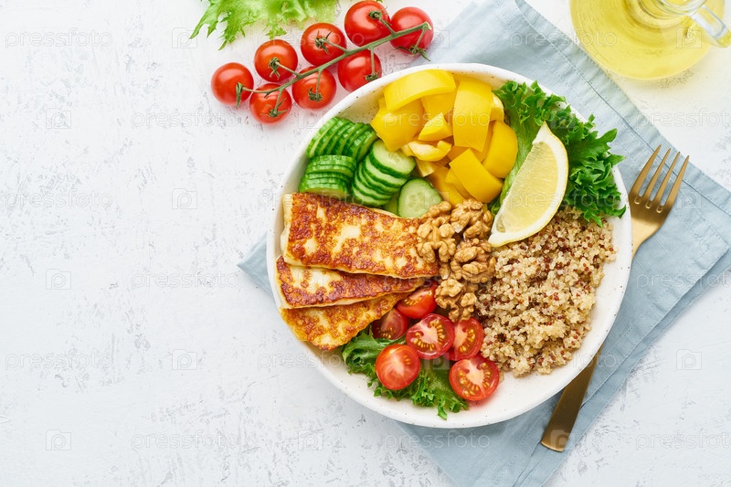 Чаша Будды с киноа, халуми, салатом-латуком, вегетарианской кухней, белый фон, вид сверху