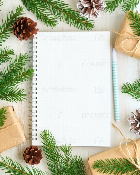 Белый открытый блокнот, журнал для списка желаний и рождественского украшения на белом деревянном фоне, плоская планировка, место для копирования. Ручная работа, без пластика, концепция нулевых отходов. Макет